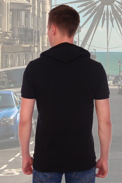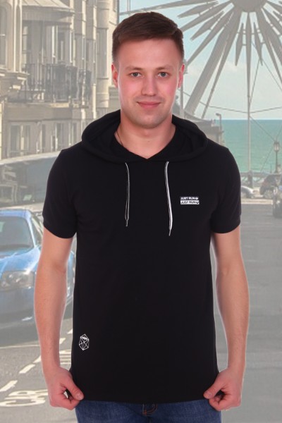 Особенности: Футболка мужская с капюшоном. Слева на груди и снизу с противоположной стороны принт. Внизу по бокам небольшие разрезы.