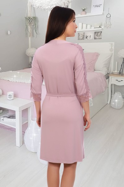 Особенности: Пеньюар из вискозы. Халат с кружевом по рукавам, на запах. Сорочка с лифом, оформленным бантом, и кружевом по низу.